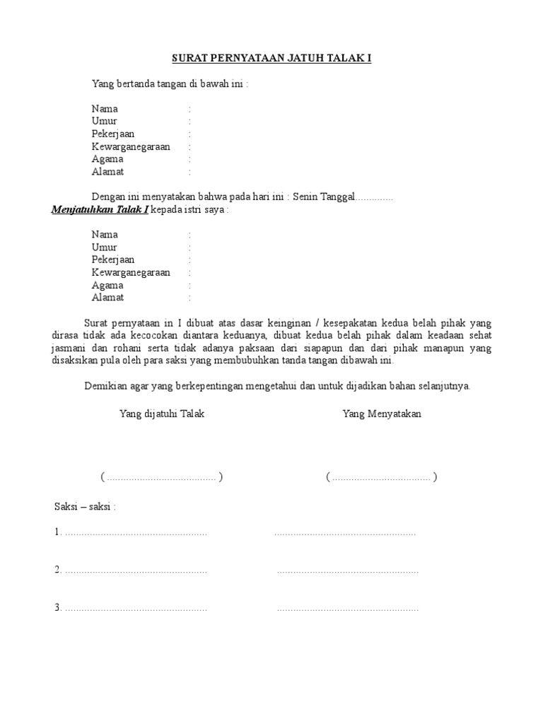 Pernyataan cerai sepihak oleh istri contoh surat pernyataan cerai talak 1 contoh surat pernyataan. Jika anda merasa cocok dengan tawaran kerjasama tersebut, maka anda bisa membalasnya dan menanyakan. Dan sebagai bentuk proses dari perceraian, maka kita harus membuat surat cerai. Rumah tangga memang tidak selalu bertahan dengan baik, dan ada pasangan tertentu yang tidak bisa pihak pertama dan pihak kedua telah sepakat untuk mengakhiri hubungan suami istri di mata hukum dengan alasan ketidakharmonisan kehidupan rumah tangga. Nama umur pekerjaan alamat :